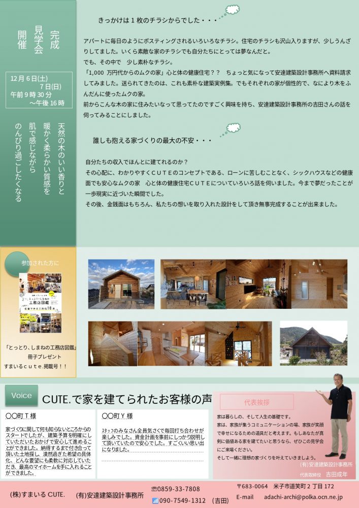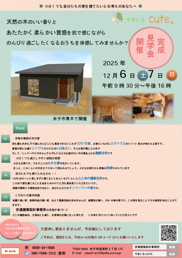 完成見学会開催!! 日程 2025年 12月 06日 (土) ~ 2025年 12月 07日 (日) 時間 9:30 am ~ 4:00 pm 場所 米子市青木地内 参加申し込みはこちら小さな平屋のお家が完成しました。見学会を開催いたします。ご希望の方はメールもしくはお電話でお問合せ下さい。お待ちしております